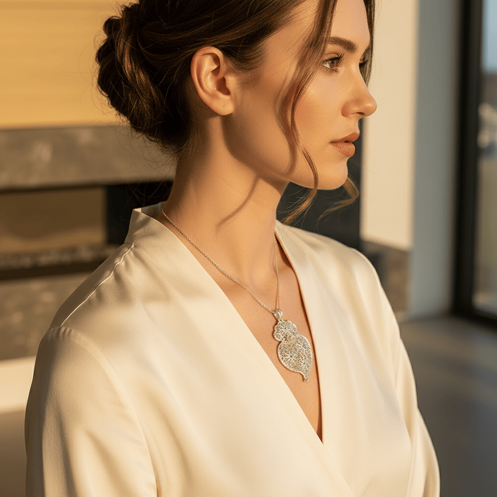 Ce pendentif incarne l’excellence de l’orfèvrerie portugaise. Rien d’industriel ici, aucun moulage, seulement le geste, la maîtrise, le temps. Chaque fil d’argent est façonné à la main, patiemment entrelacé par un artisan orfèvre. Le filigrane est aérien, précis, presque vivant, il révèle les volumes sans jamais les figer.