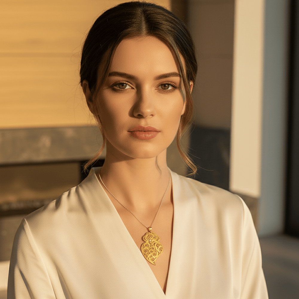 Ce pendentif incarne l’excellence de l’orfèvrerie portugaise. Rien d’industriel ici, aucun moulage, seulement le geste, la maîtrise, le temps. Chaque fil d’argent est façonné à la main, patiemment entrelacé par un artisan orfèvre. Le filigrane est aérien, précis, presque vivant. La dorure à l’or fin, obtenue par bain d’or, révèle les volumes sans jamais les figer.