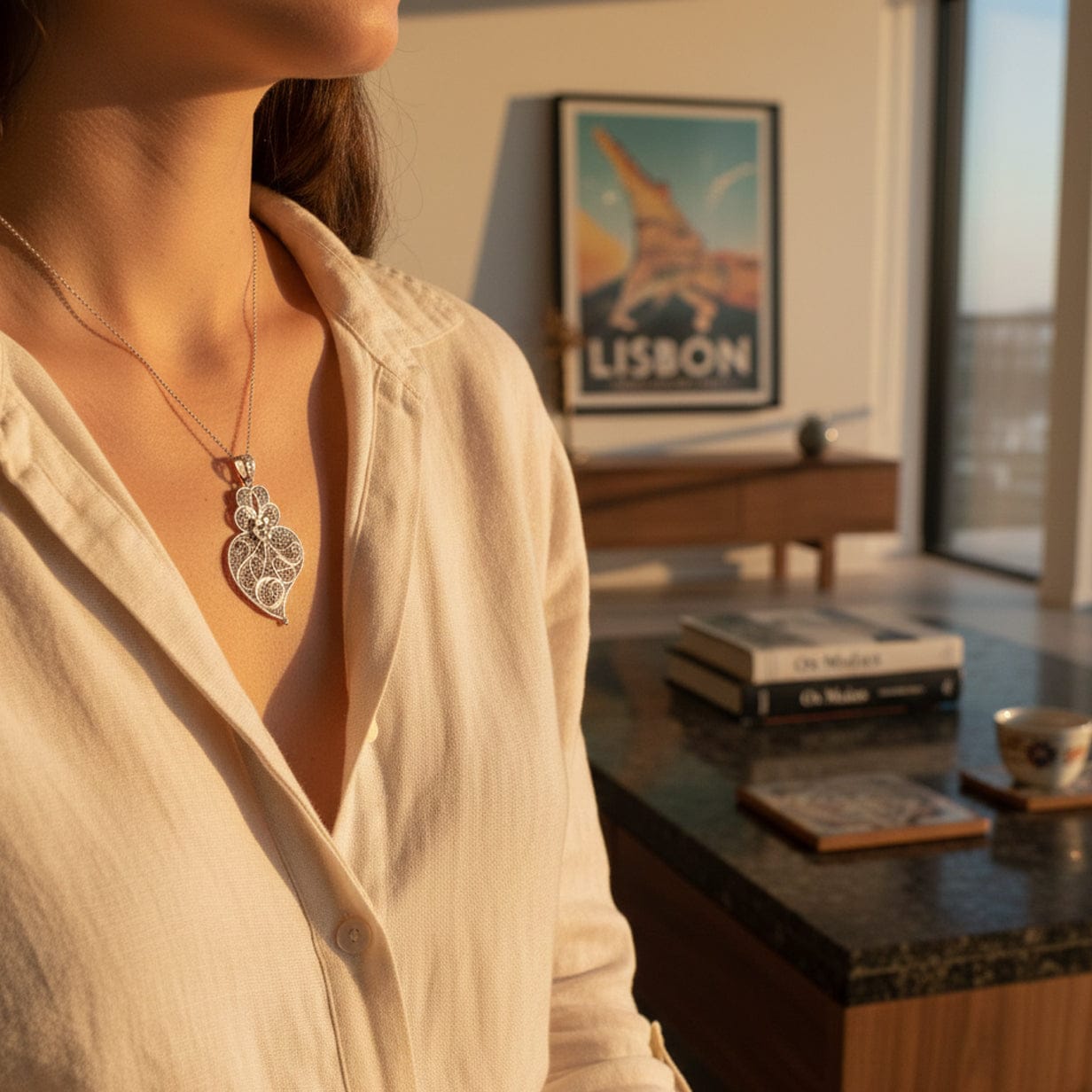 Ce pendentif incarne l’excellence de l’orfèvrerie portugaise. Rien d’industriel ici, aucun moulage, seulement le geste, la maîtrise, le temps. Chaque fil d’argent est façonné à la main, patiemment entrelacé par un artisan orfèvre. Le filigrane est aérien, précis, presque vivant. La dorure à l’or fin, obtenue par bain d’or, révèle les volumes sans jamais les figer.