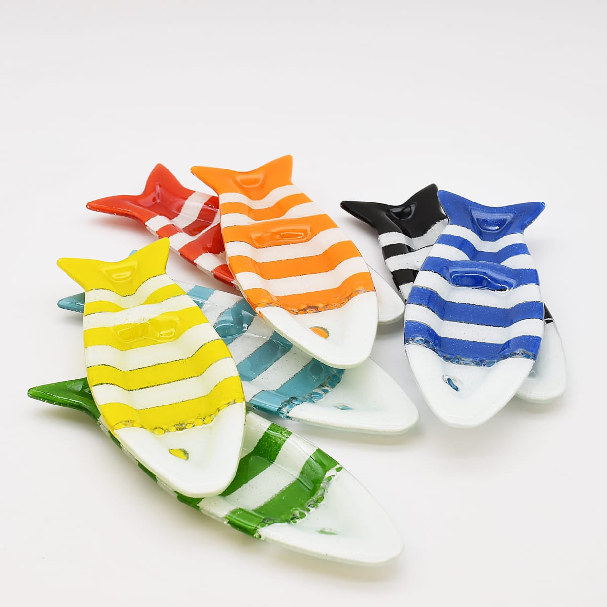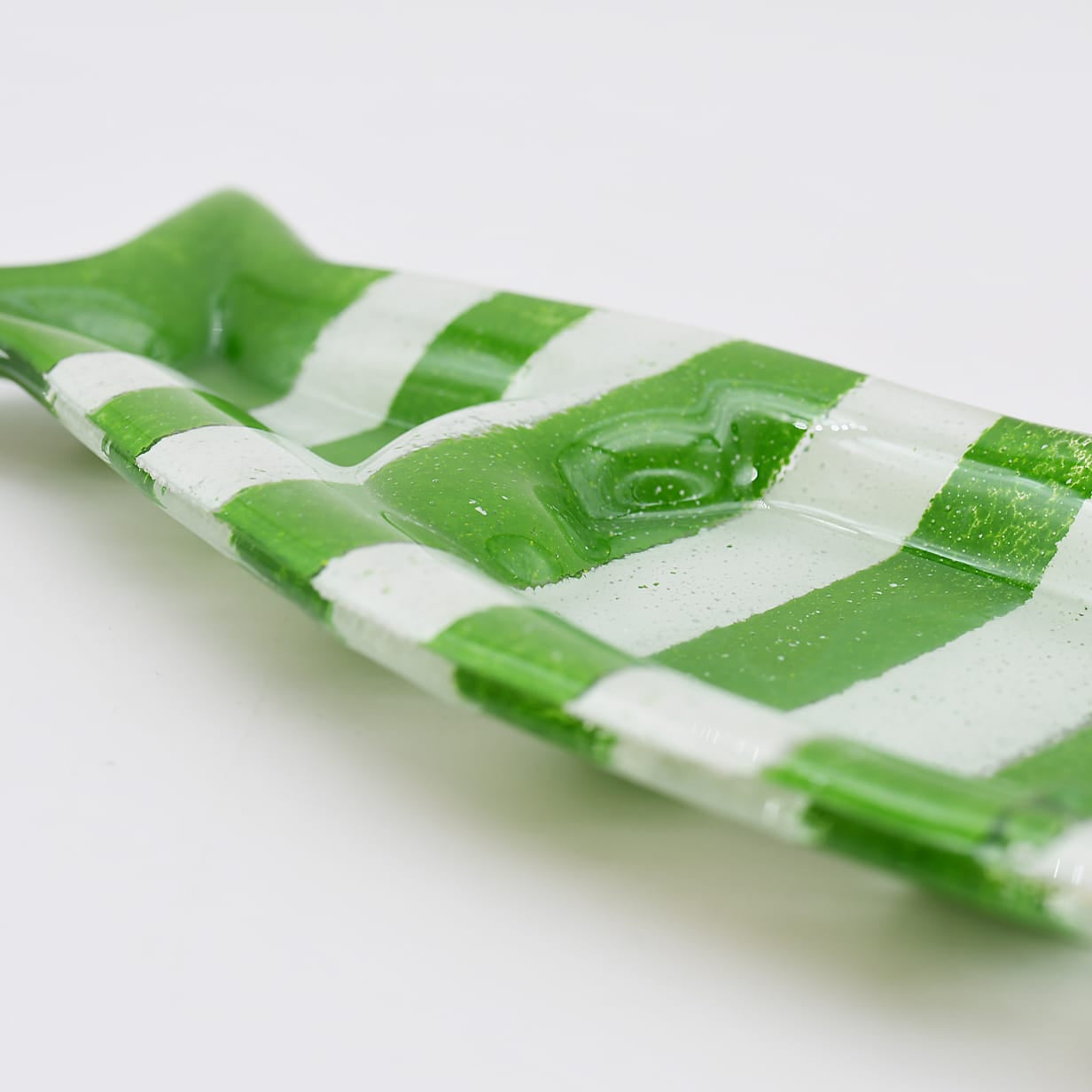 Cette coupe en verre fusionné rayée vert & blanc en forme de sardine est parfaite pour accompagner un apéritif. Ses deux compartiments structurent l’usage : d’un côté les olives, de l’autre les noyaux.
