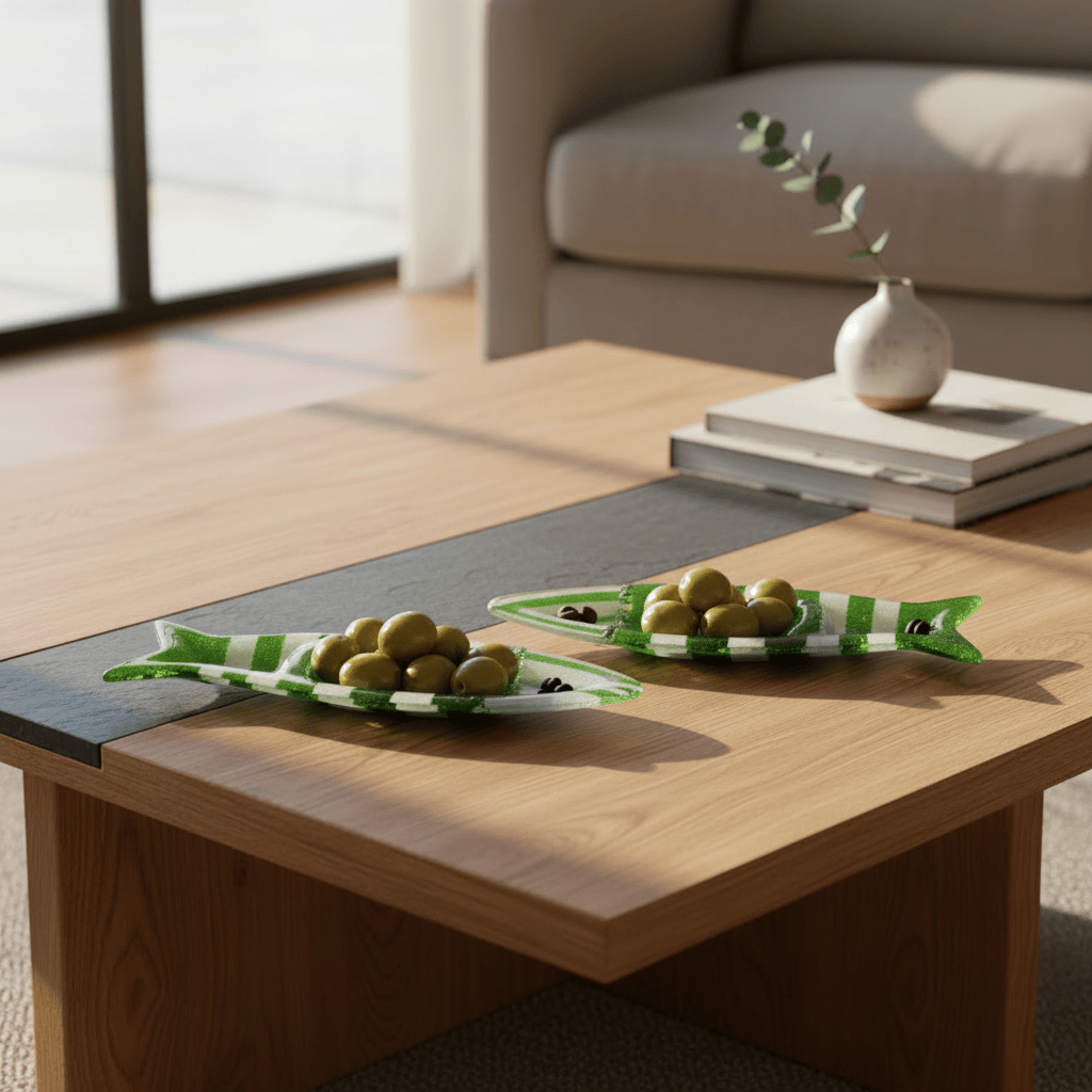 Façonnée à la main à Marinha Grande, elle joue avec la transparence et la lumière. Le verre fusionné crée des nuances, des mouvements, de légères variations qui rendent chaque coupe vivante.