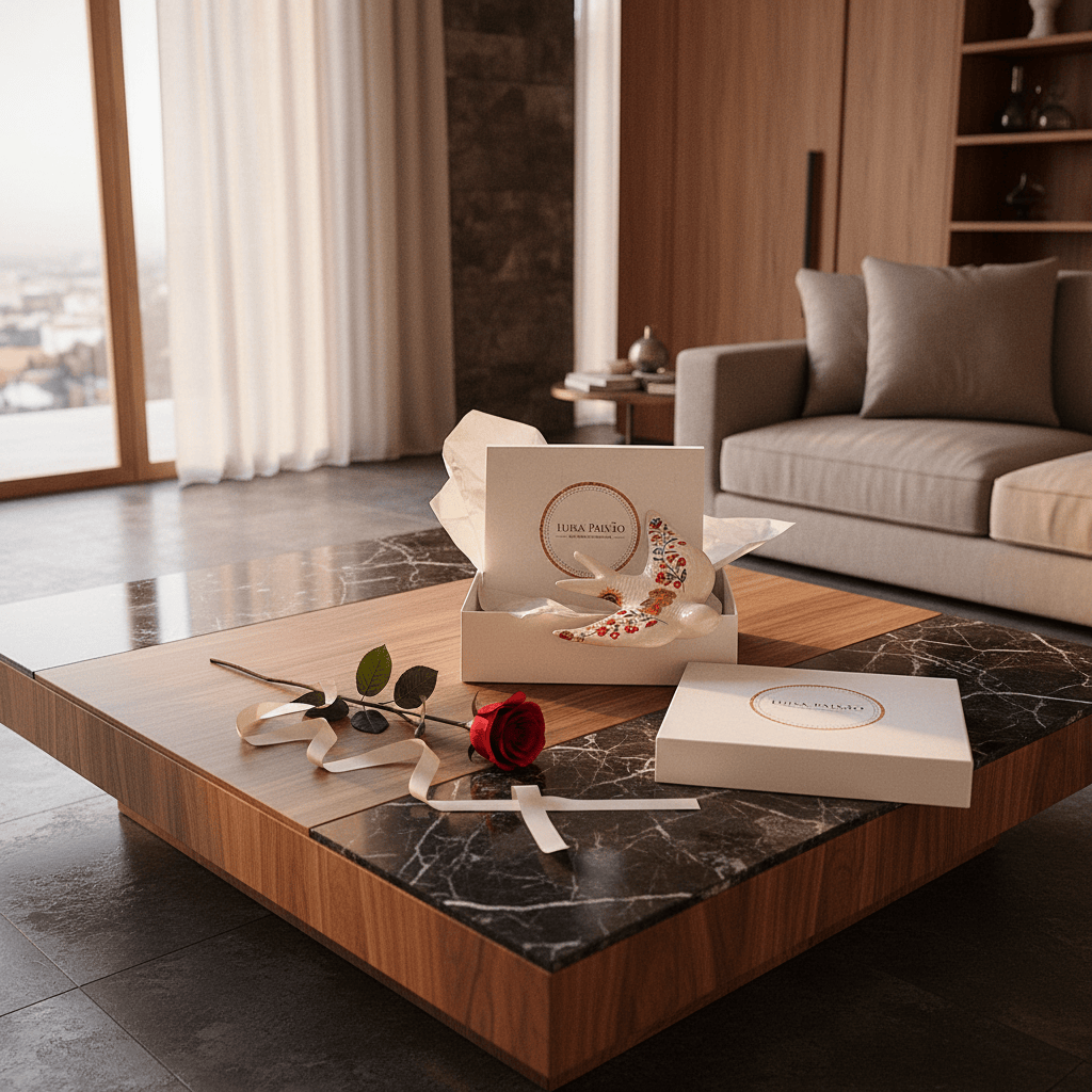 Dans le Nord du Portugal, le motif Namorados célèbre l’amour et les promesses. L’hirondelle, elle, symbolise le retour, la fidélité, la protection du foyer. Présentée dans son coffret Luisa Paixão, cette hirondelle devient plus qu’un objet décoratif : un message discret, tendre, durable.
