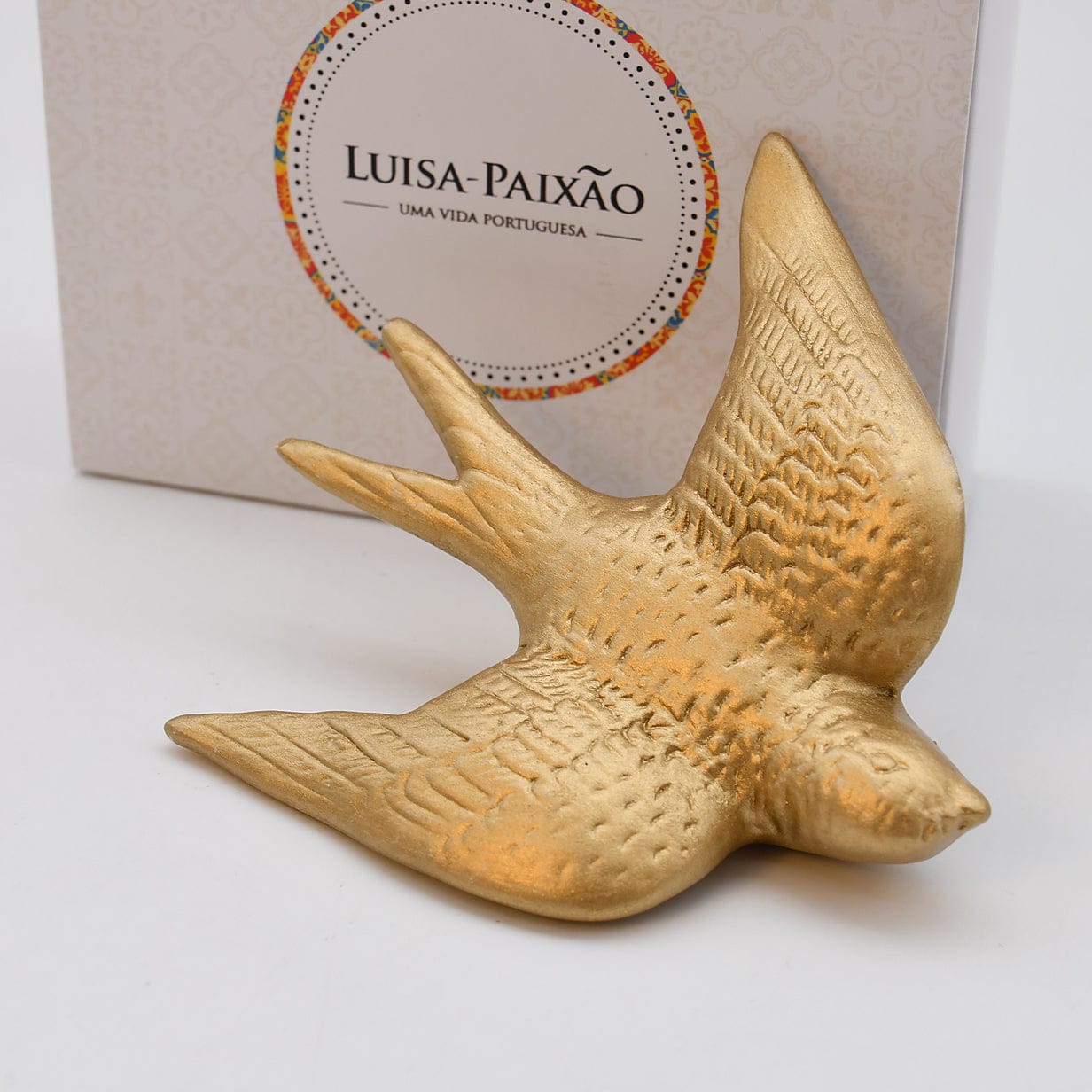 Joli petit coffret abritant une hirondelle en céramique dorée réalisée, en exclusivité, dans un atelier artisanal du centre du Portugal.