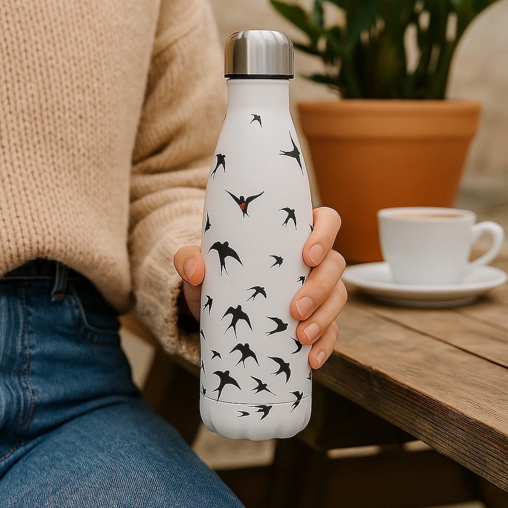 Emportez avec vous un peu de poésie portugaise grâce à ce magnifique thermos décoré de délicates hirondelles noires, symbole de liberté, d’amour et de fidélité au Portugal.