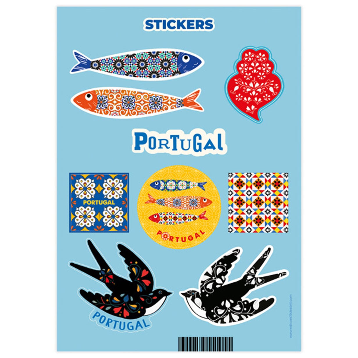 Planche d'autocollants représentant les icônes portugaises : Azulejos, sardines, hirondelles, Coeur de Viana...