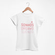 Tee-shirt blanc pour femme, de coupe moderne et cintrée, avec une illustration exclusive créée pour Luisa Paixão. L'illustration est composée du mot "Sonhos" (Rêve en portugais) et d'un logo subtil et léger reprenant les motifs habituellement utilisés pour les azulejos portugais.