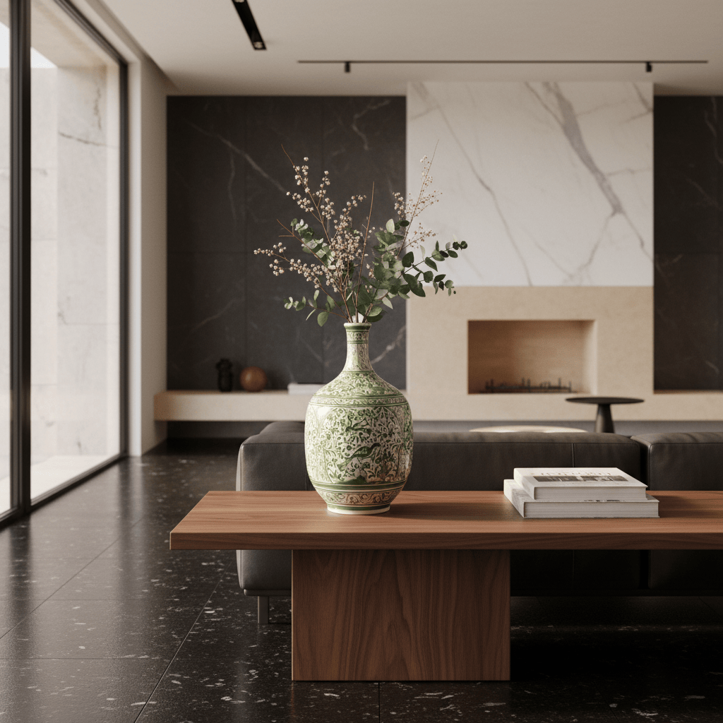 Beautiful ceramic amphora from Coimbra with deep green colors traditionally representing scenes of nature, plants, exotic birds.