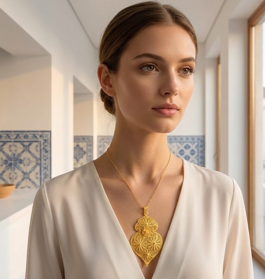Ce pendentif incarne l’excellence de l’orfèvrerie portugaise. Rien d’industriel ici, aucun moulage, seulement le geste, la maîtrise, le temps. Chaque fil d’argent est façonné à la main, patiemment entrelacé par un artisan orfèvre. Le filigrane est aérien, précis, presque vivant. La dorure à l’or fin, obtenue par bain d’or, révèle les volumes sans jamais les figer.