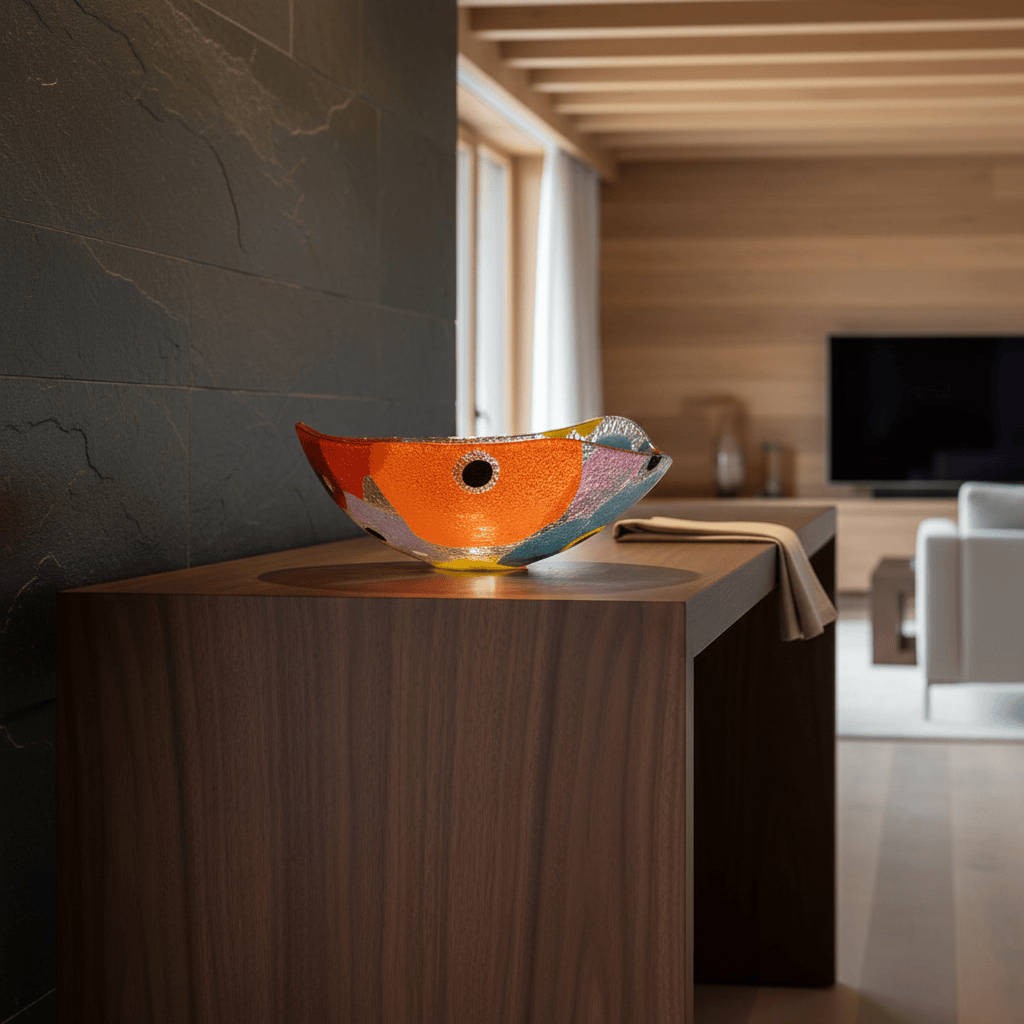 Cette pièce en verre est dessinée par Sílvia, une jeune designer portugaise puis fabriquée par par Rui, son mari, dans leur atelier de Marinha Grande, le berceau du verre portugais. Cet atelier artisanal et familial, créé en 1997 combine la tradition du verre de Marinha Grande et le processus innovant de de "fusing".