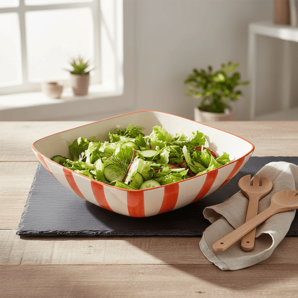 Très beau saladier en céramique, rayé rouge et blanc pratique pour servir une grande salade évidemment mais aussi un plat de pâtes, de riz ou tout autre accompagnement.