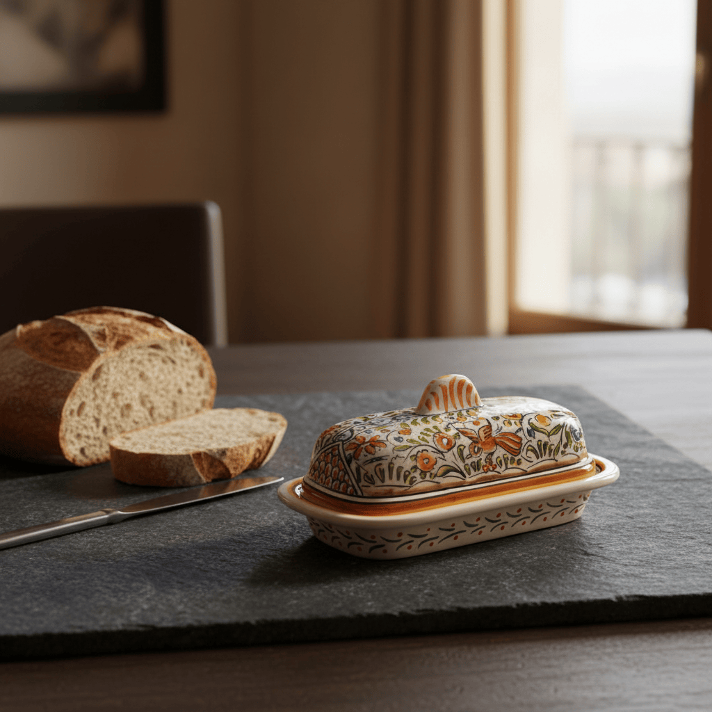 Magnifique beurrier en céramique de Coimbra aux couleurs chatoyantes représentant traditionnellement des scènes de la nature, des plantes, des oiseaux exotiques.