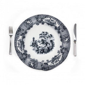 Set de table de 40cm de diamètre en fibres recyclées, imprimé avec une évocation des motifs traditionnellement utilisés par la fabrique de vaisselle Sacavém, fondée en 1856 et aujourd'hui reconvertie en musée.